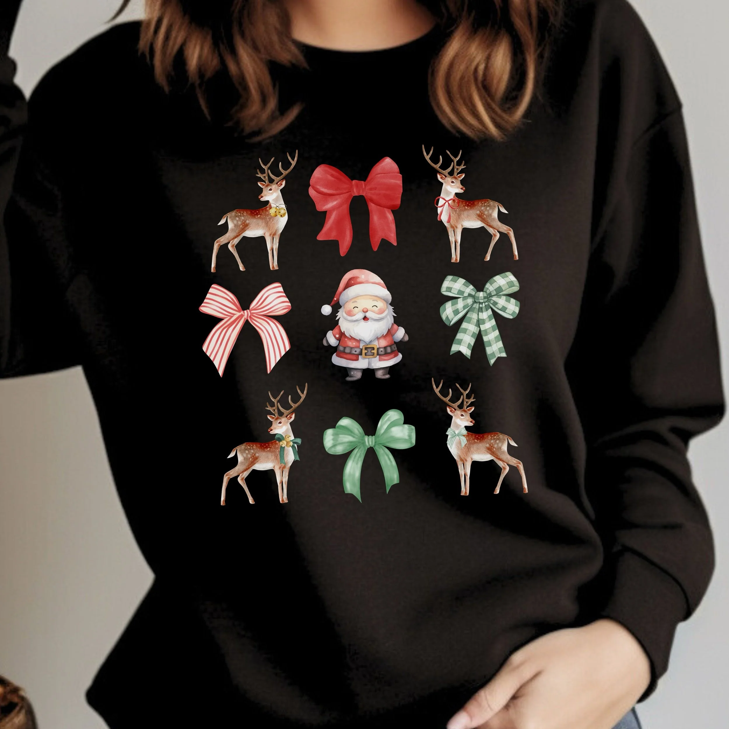 Get festive in the sweetest way with this cozy holiday crewneck featuring an adorable arrangement of reindeer, Christmas bows, and a classic Santa. The charming layout gives this sweatshirt a warm, nostalgic Christmas feel—perfect for anyone who loves cute, cheerful, retro-inspired holiday designs.