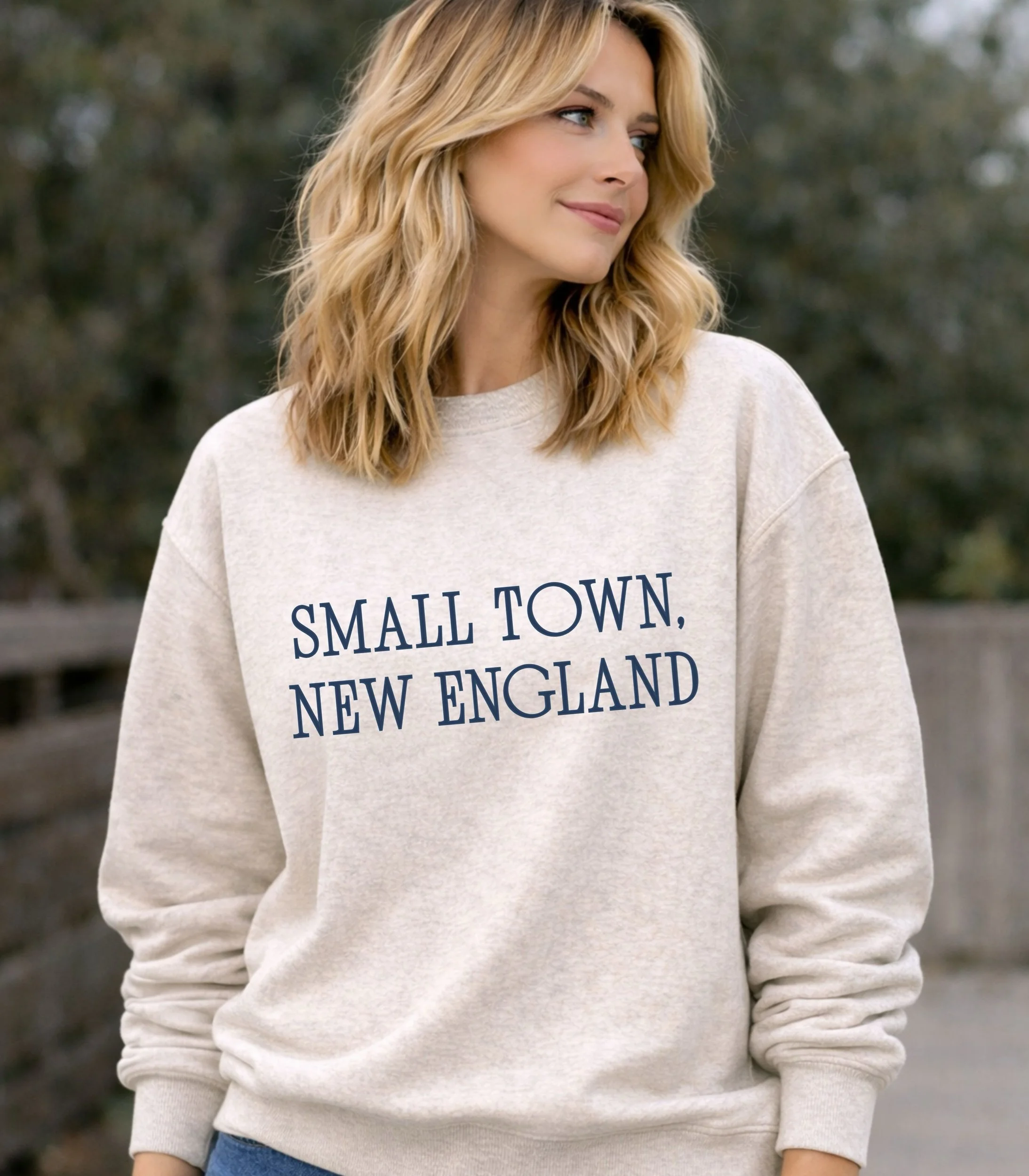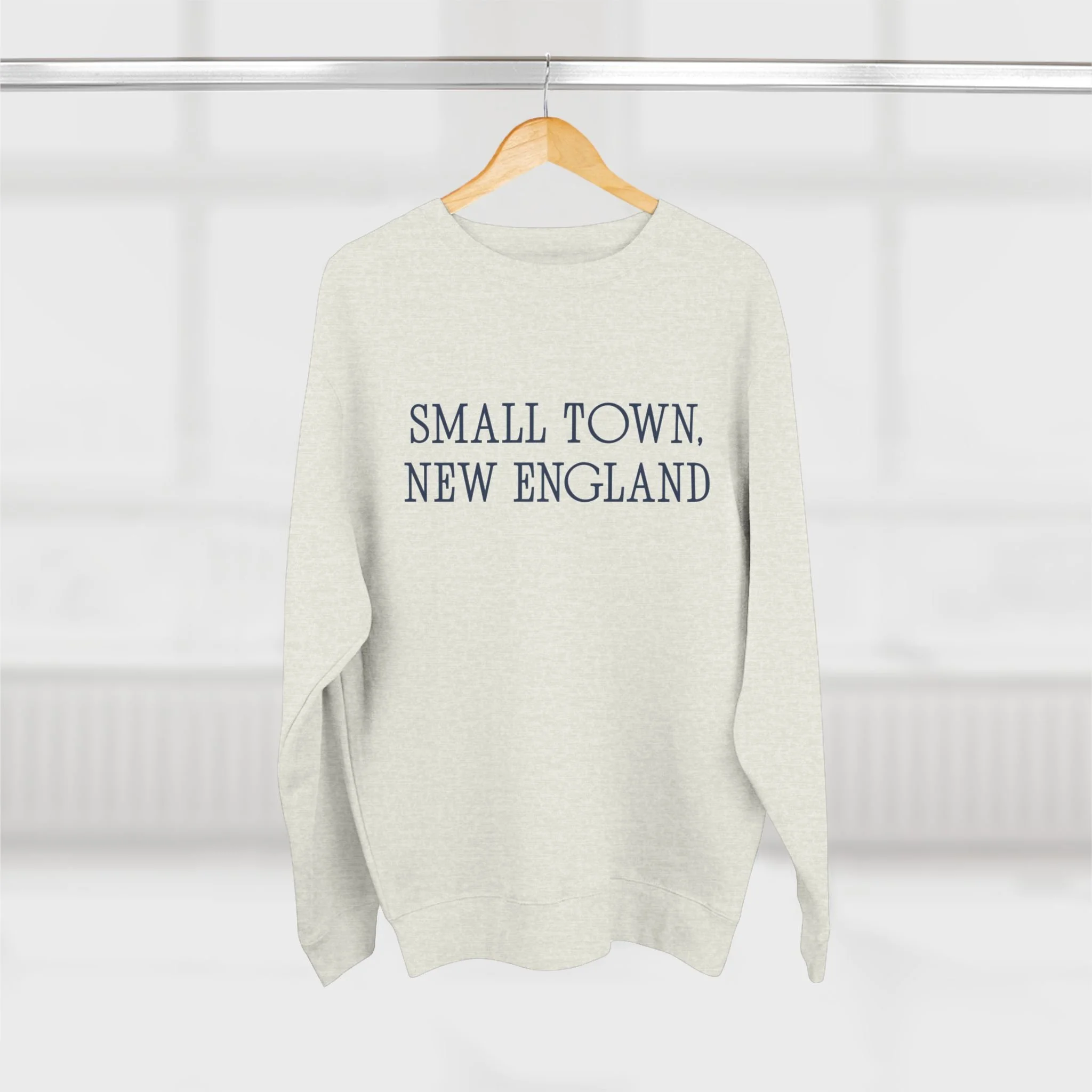 A timeless nod to the charm of small-town New England. This classic crewneck features a simple navy Small Town, New England design printed on a soft oatmeal heather sweatshirt—perfect for cool coastal mornings, fall weekends, and everyday wear.